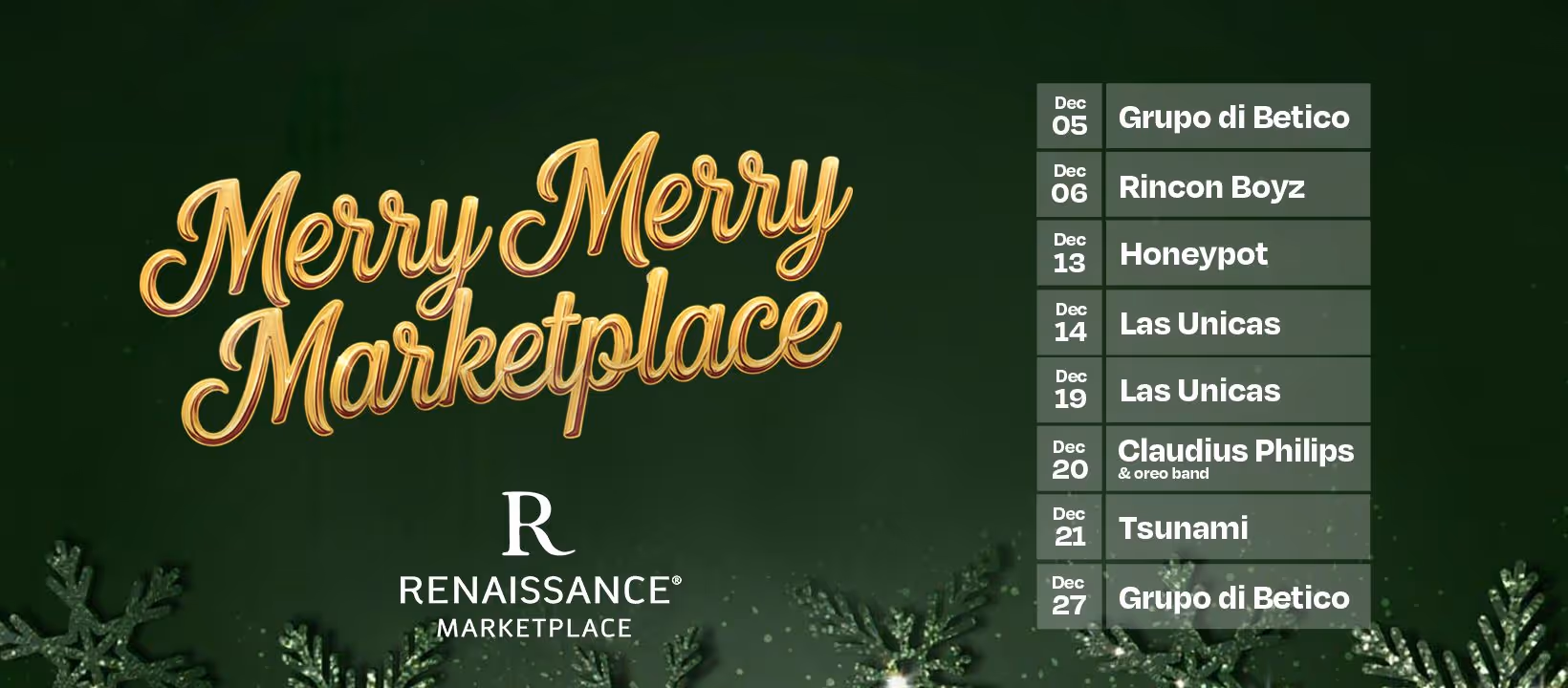 Merry Merry Marketplace 2025 brings the holiday spirit to life in the heart of Oranjestad with festive evenings filled with music, lights, and joyful moments for all ages. From live entertainment and cheerful performances to ice skating, Santa visits, and delicious food options, the Marketplace transforms into a vibrant Christmas destination where families, friends, locals, and visitors can gather and celebrate the season together. Set against the open air charm of the Marketplace, this event blends island vibes with classic holiday magic, making it the perfect place to create unforgettable December memories.